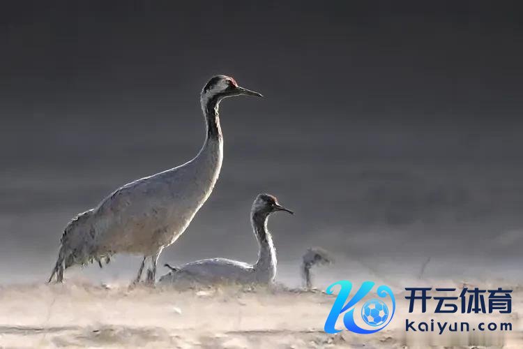目下的气候让我已而屏住了呼吸,一群灰鹤正洒落在枯黄的草甸上,有的抬头伫立,有的折腰啄食,还有两只正卧在草甸上,在暖黄的光影里完成一场优雅的“对话”。