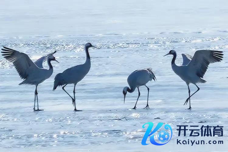 逆光里的冰面泛着细碎的银辉,四只灰鹤在这清凉的舞台上舒展身姿:有的振翅欲飞,翅尖在光影里划出墨色曲线;有的冷静漫步,长腿在冰面落下浅痕;还有的垂首轻啄,仿佛在与冰层下的天下密语。每一种姿态王人带着原野的安逸,让这片冬日的冰面,成了独属于它们的灵动诗行。