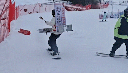 12月10日(报说念时辰),在新疆可可托海某滑雪场,别称男人身背烧烤架,在滑雪场一边滑行一边卖烧烤。