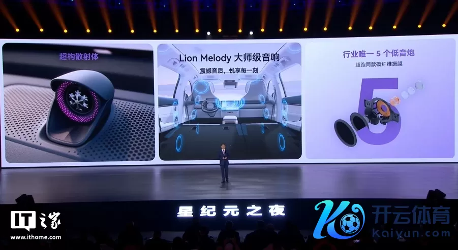 此外,该车配备透光面积 1.27 超大天幕、无级变速电动遮阳帘、5 层复合材料遮光幕布,搭载 Lion Melody 大家级音响,行业独一 5 个低音炮。该车搭载高通骁龙 8295P 芯片,配备 AI 用车助手、15.6 英寸悬浮式中控屏以及 10.25 英寸悬浮式姿色盘