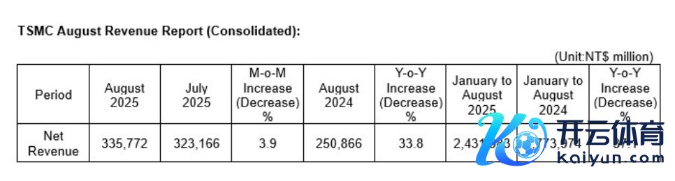 台积电:8月销售额3357.7亿元台币 同比增长33.8%体育游戏app平台台积电:8月销售额3357.7亿元台币 同比增长33.8%