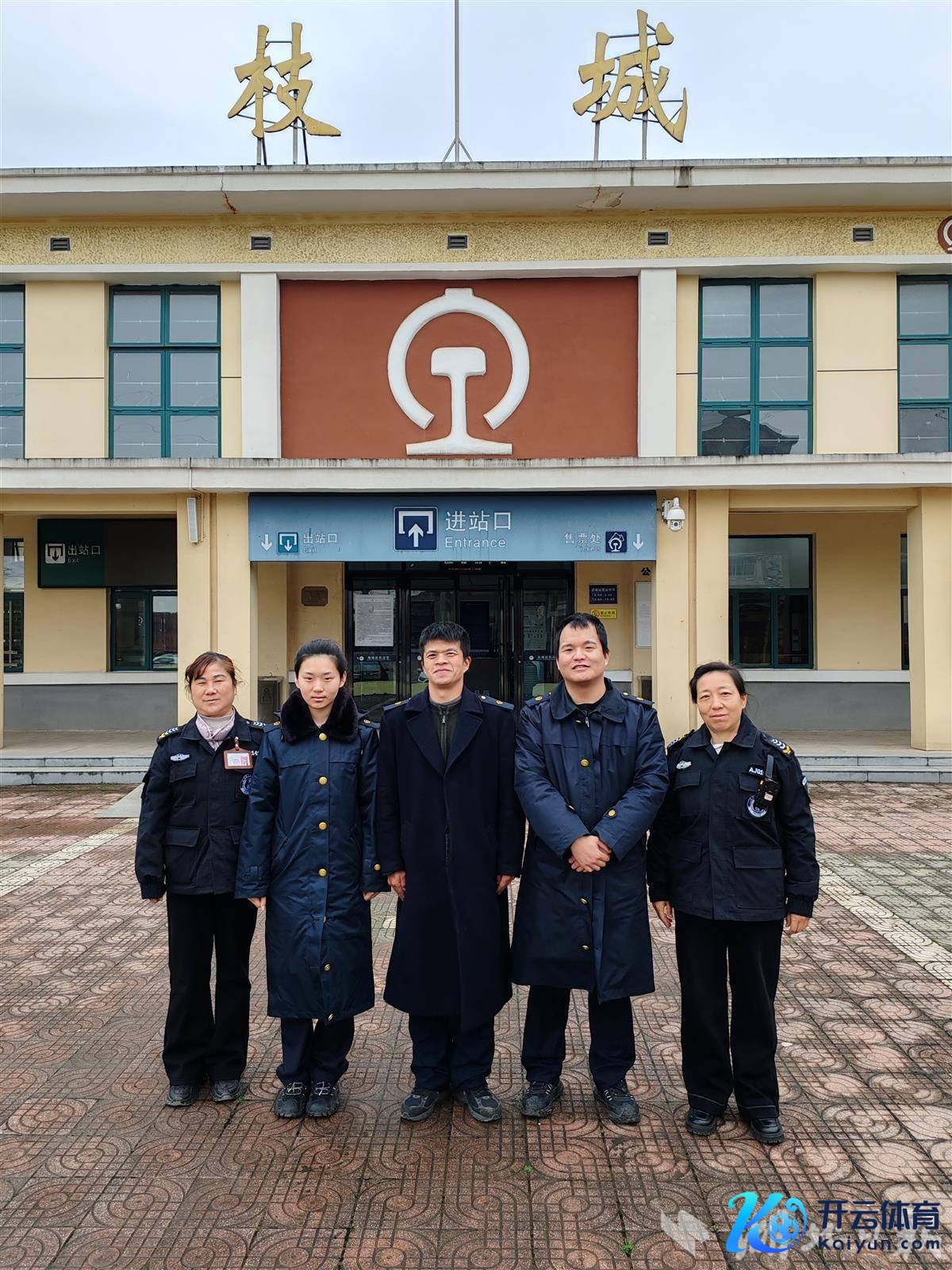 枝城站客运5东说念主组,左起永别是:张艳(安检员),贾乙(客运员),王雄心(客运员),陈俊逸(客运员),何绍芹(安检员)