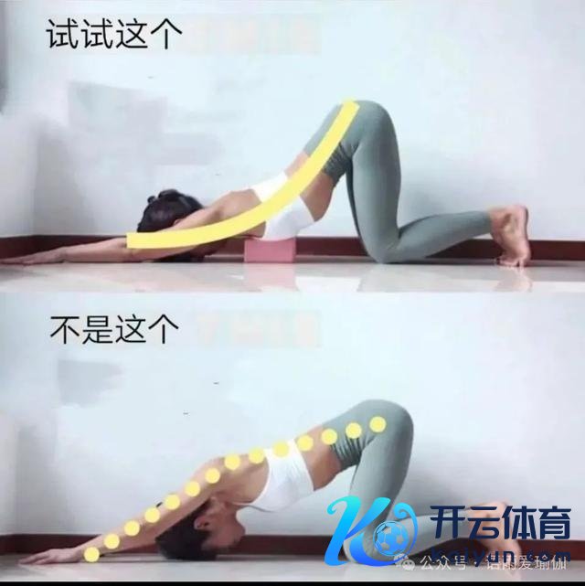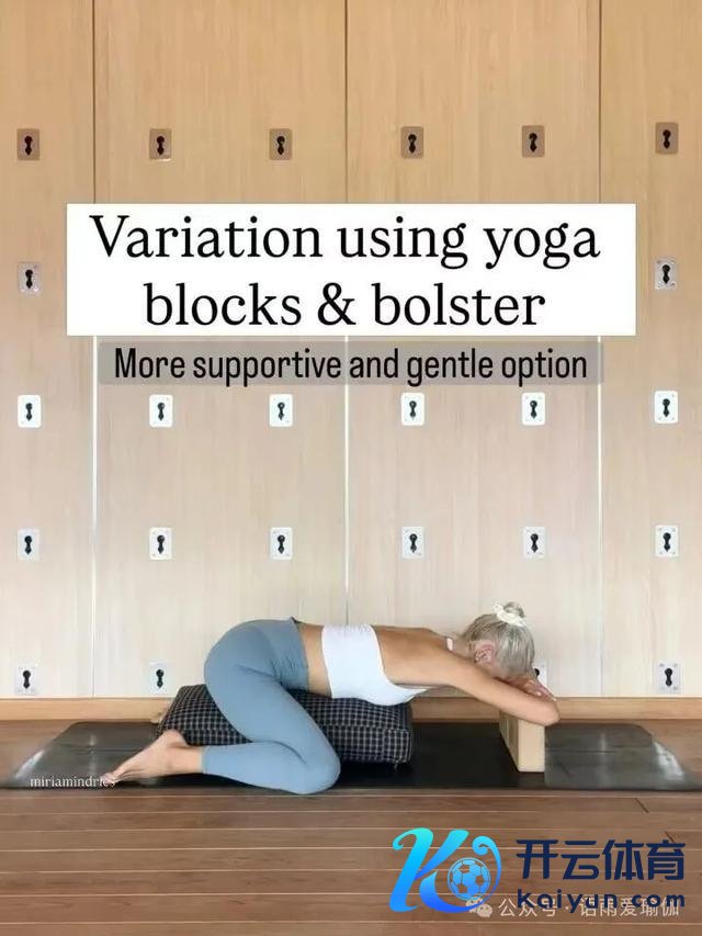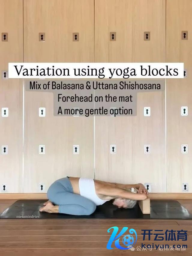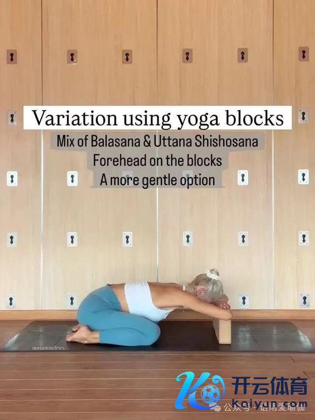 使用瑜伽砖进行的变式纯熟——婴儿式与小狗伸展式的齐集体,额头贴着垫子,是一种更平和的选拔。