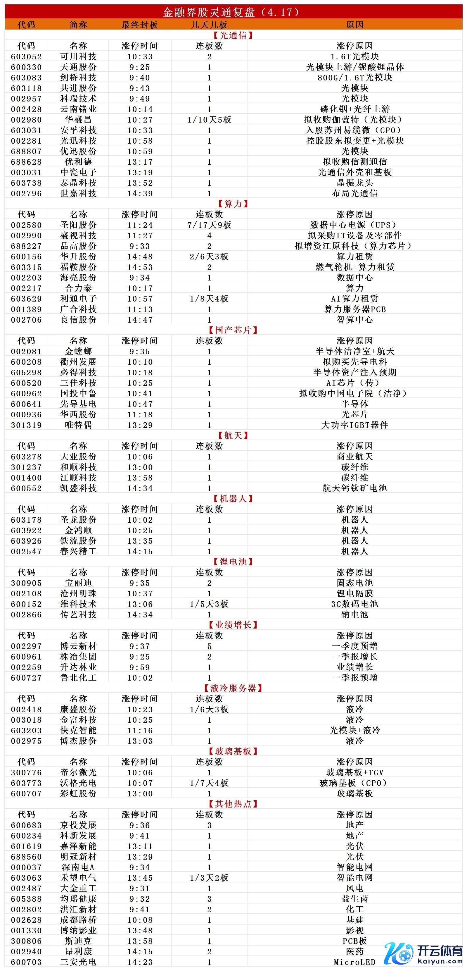 4月17日,创业板指涨超1%,再创近11年新高。中际旭创在一季报功绩高增的带动下涨超5%续翻新高,源杰科技涨超10%股价高出茅台成A股新“股王”。盘面上,大小盘股跷跷板行情昭着,全市集近3000只个股着落。从板块来看,算力产业链捏续爆发,其中CPO成见反回生跃,十余只有素股涨停,剑桥科技、光迅科技涨停创历史新高,华盛昌5天3板。PCB成见延续强势,广合科技涨停创历史新高。液冷处事器成见捏续活跃,圣阳股份晋级7连板不时朝上拓展连板空间,博杰股份、金富科技、康盛股份、海亮股份涨停。算力租借成见再度走强,利通电子无惧昨日尾盘炸板4天3板续创历史新高,协力泰、品高股份、三安光电涨停。